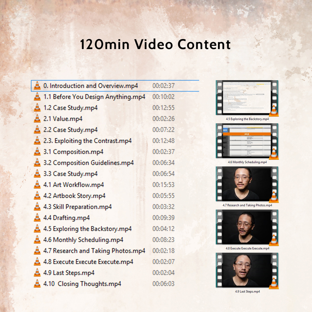 • Over an hour video of me talking on various topics like what you should do before making an artwork, value, composition, artwork step-by-step, and how I can make my artbook in less than 12 months.